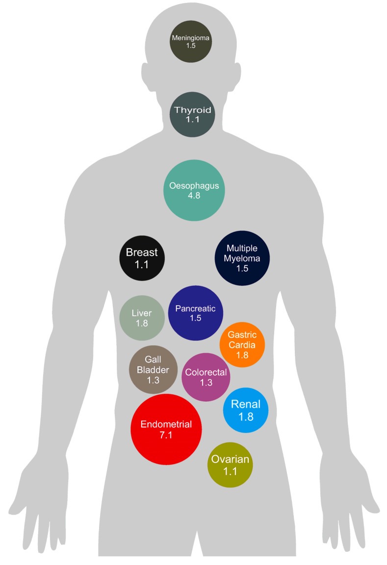 Ifølge Verdenssundhedsorganisationen (WHO) er overvægt eller fedme tydeligt forbundet med en øget risiko for at udvikle 13 forskellige kræftformer [1,11]: